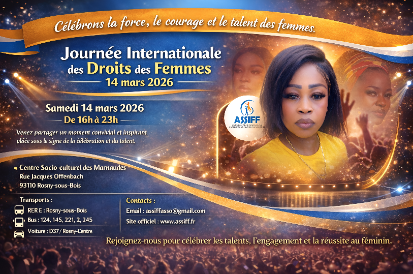 En raison de la disponibilité de la salle à Rosny-sous-Bois, la célébration de la Journée internationale des femmes aura lieu le samedi 14 mars 2026, de 16h à 23h.